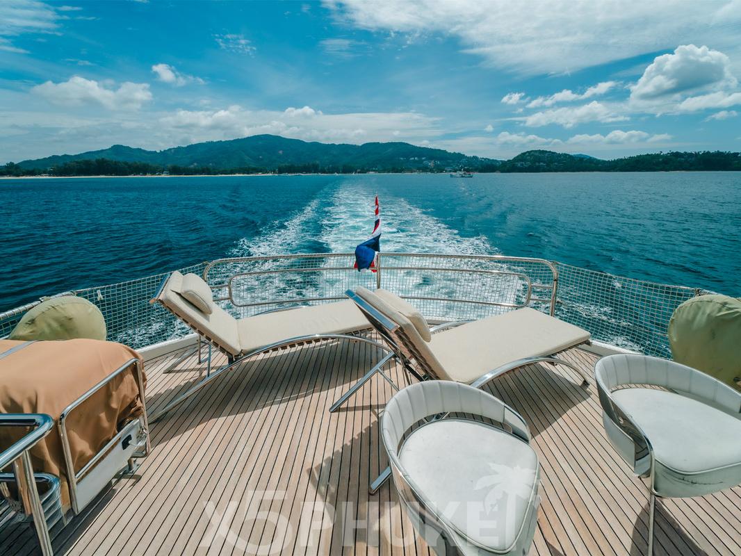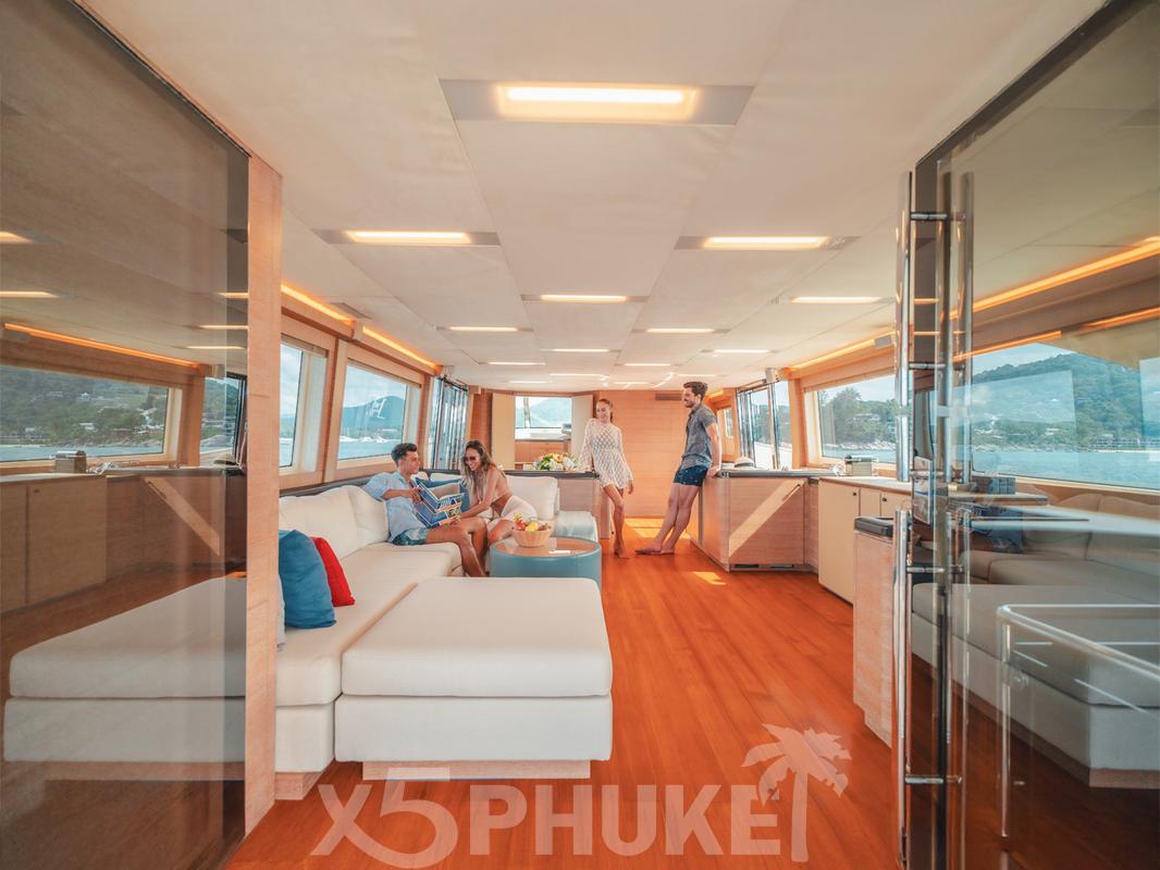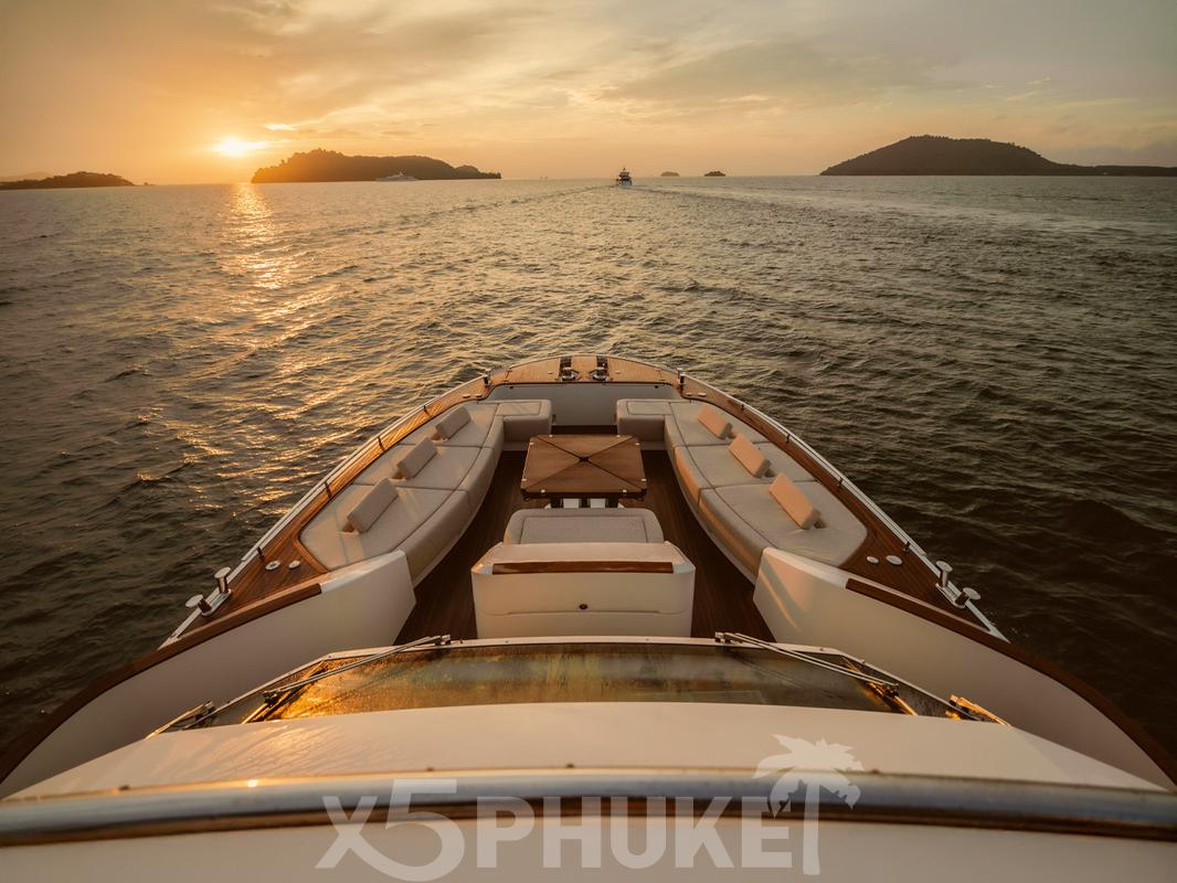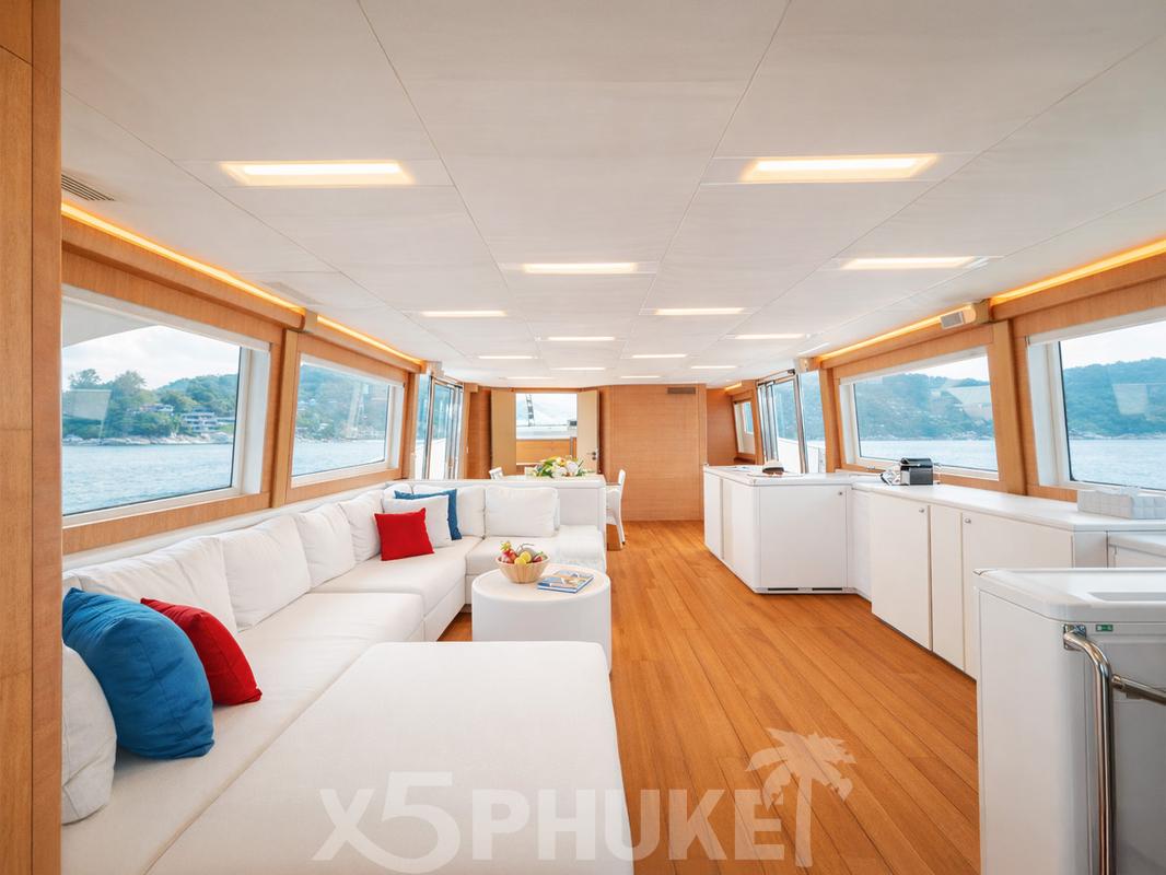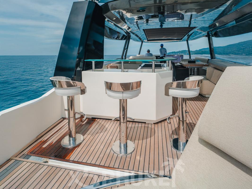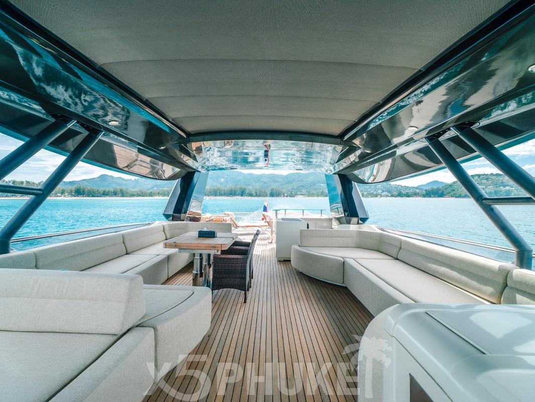 MCY 86 выделяется просторными зонами отдыха на открытом воздухе. В носовой части расположена уютная лаунж-зона, идеально подходящая для закатов и спокойного отдыха. Закрытый флайбридж обеспечивает комфорт независимо от погодных условий и оборудован зоной отдыха и барбекю. Кокпит предназначен для обедов и ужинов на свежем воздухе во время морских прогулок вокруг Пхукета.
