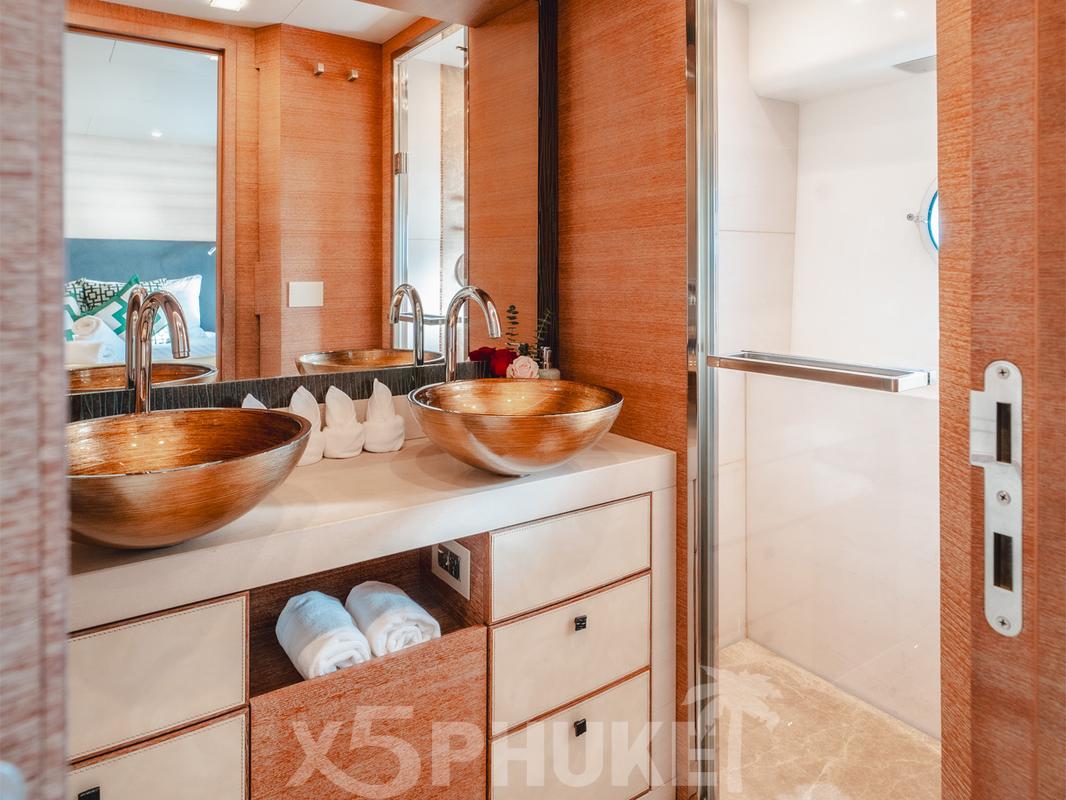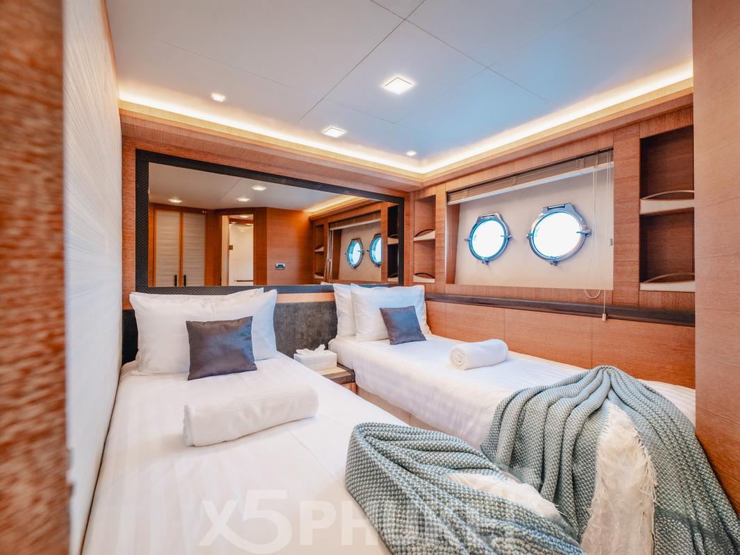 На борту предусмотрено размещение до 8 гостей в четырех комфортных каютах, каждая из которых оснащена собственной ванной комнатой. Планировка включает две двуспальные и четыре односпальные кровати, что удобно как для пар, так и для семей с детьми. Возможность аренды яхты с ночевкой позволяет насладиться морем без спешки и суеты.